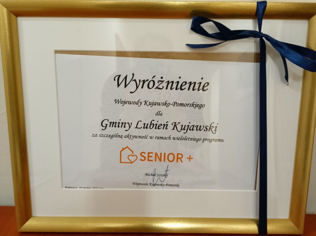 19 grudnia 2025 r. w Pałacu Bursztynowym we Włocławku odbyło się spotkanie podsumowujące 10 – lecie Programu Wieloletniego Senior +, na którym Gmina Lubień Kujawski otrzymała z rąk I Wicewojewody Kujawsko – Pomorskiego Pana Piotra Hemmerlinga wyróżnienie za szczególną aktywność w ramach wieloletniego programu. Otrzymaliśmy również podziękowania za zaangażowanie w rozwój placówek wsparcia dziennego tj. Dzienny Dom Senior + oraz innych działań podejmowanych w obszarze polityki senioralnej.