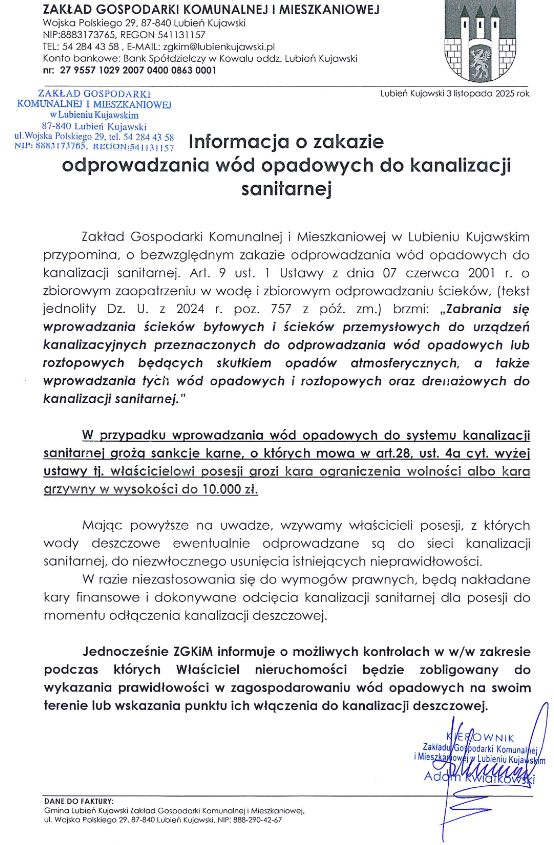 Informacja o zakazie odprowadzania wód opadowych do kanalizacji sanitarnej